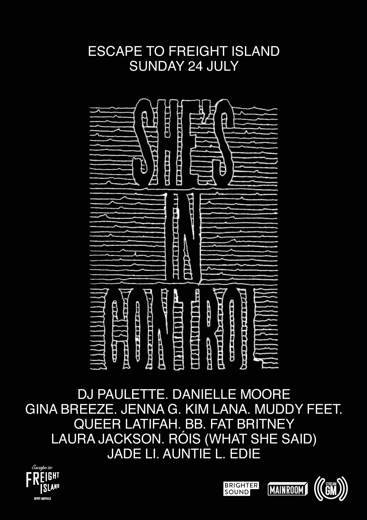 DJ’s Gina Breeze (homoelectric), Jade Li (Plastic Dreams) , Danielle Moore (Crazy P) and Edie (Studio Honey) will be live on MainRoom 430-8pm, representing Freight’s first She’s In Control day festival, with only female and people of marginalised genders taking part.