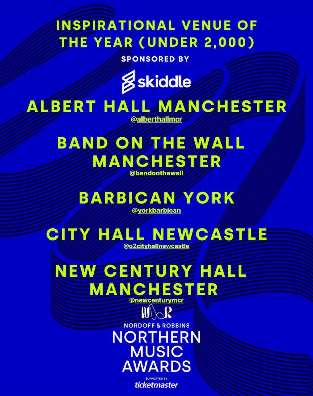 To show support for these venues that champion diverse talent and provide a platform for artists to perform in front of Northern audiences, Nordoff and Robbins will be sharing half of the proceeds from Skiddle’s sponsorship of these award categories with registered charity Music Venue Trust. The proceeds will help Music Venue Trust in continuing its mission to protect, secure and improve UK Grassroots Music Venues for the benefit of venues, communities, and upcoming artists.
